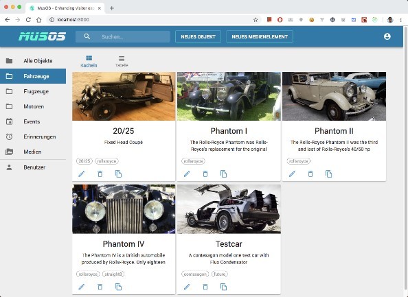 MusOS’s development was initiated by the FFA Museum and was divided into three projects. Central is the CMS (Content Management System). The essential technical aspect is the format of objects, object types and hierarchies. Additional fields for an object type or even a completely new type can be implemented in fractions of a second without any programming knowledge or necessity of a software company. Object types in the museum are of course all exhibits, but we extended the concept.